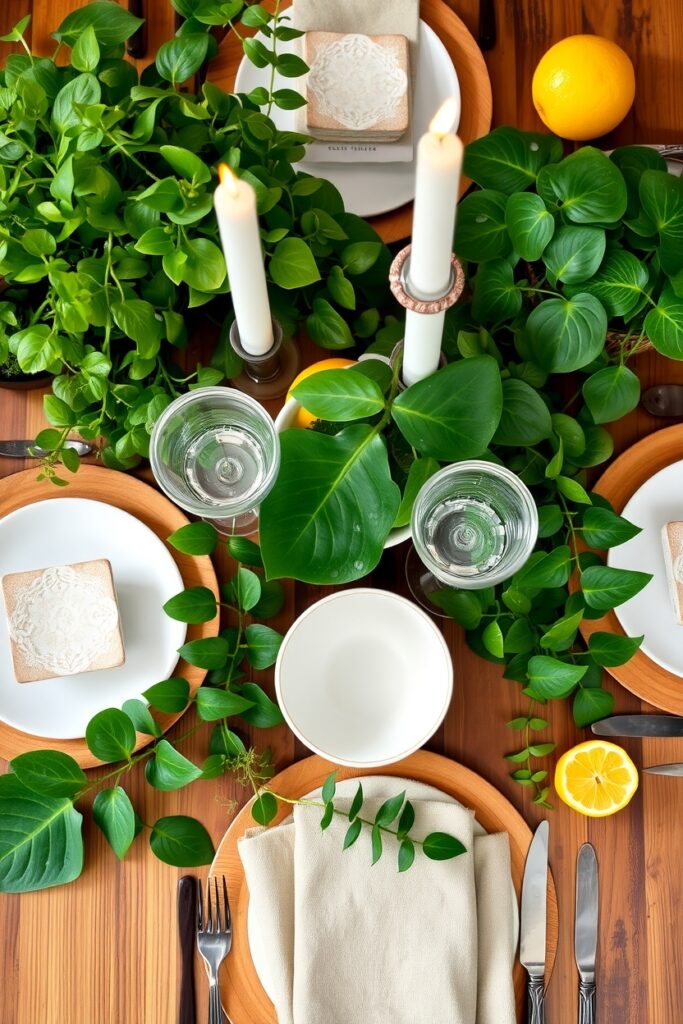 Pair the greens with wooden plates and white ceramics. A combination that feels earthy and modern at once. Mist the leaves right before dinner the tiny droplets catch candlelight and shimmer like dew.