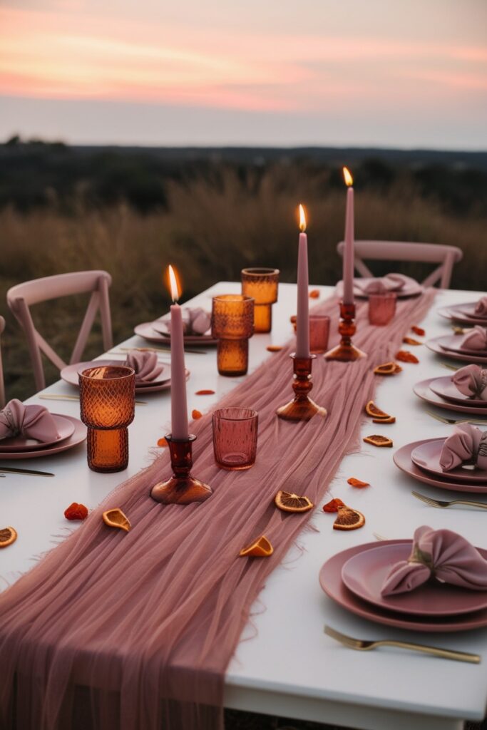 Lay a gauzy mauve runner, add blush-toned napkins, and let your candles burn in amber holders. The tones melt together like the horizon right after sunset.