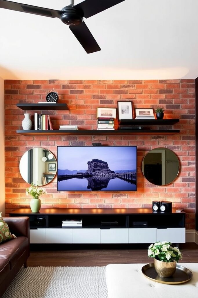 Last one, but easily one of the most striking. Layer your brick wall with floating shelves, mirrors, and subtle lighting.