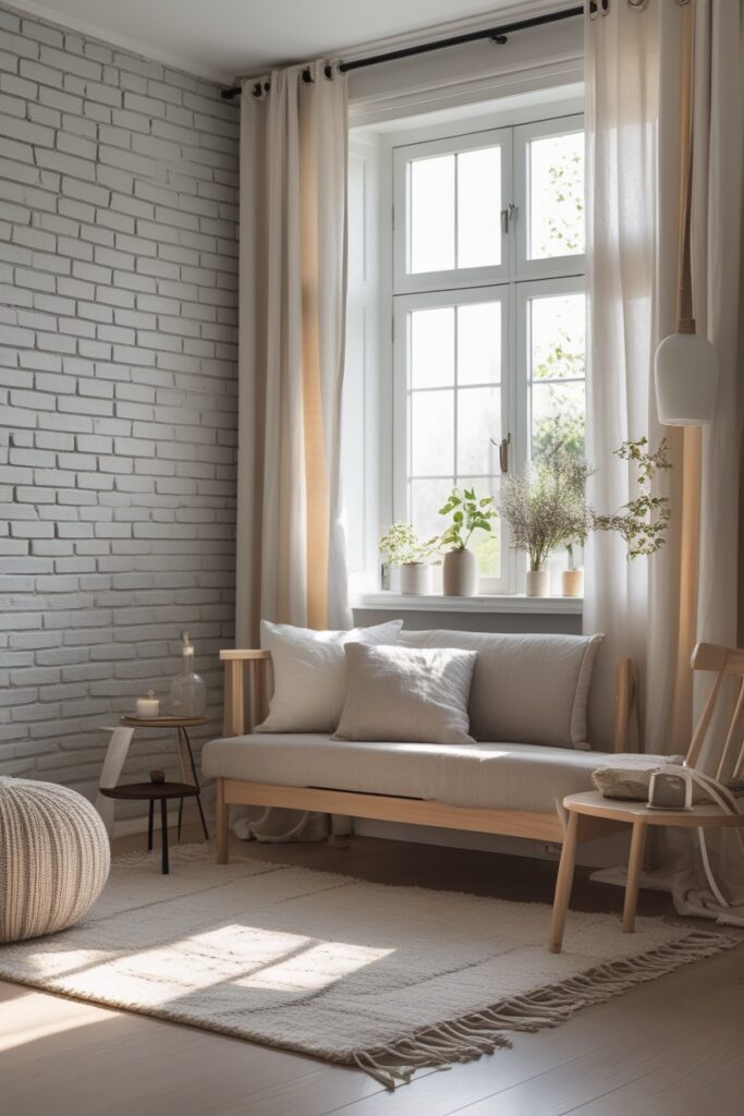 White or pale gray brick walls blend perfectly with blonde wood furniture, wool rugs, and soft lighting.