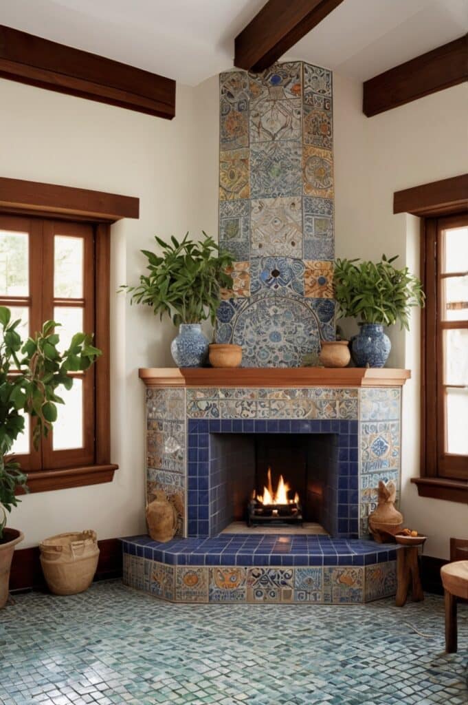 Imagine tiny tiles in deep blues or bright oranges wrapping the corner where the fire lives.