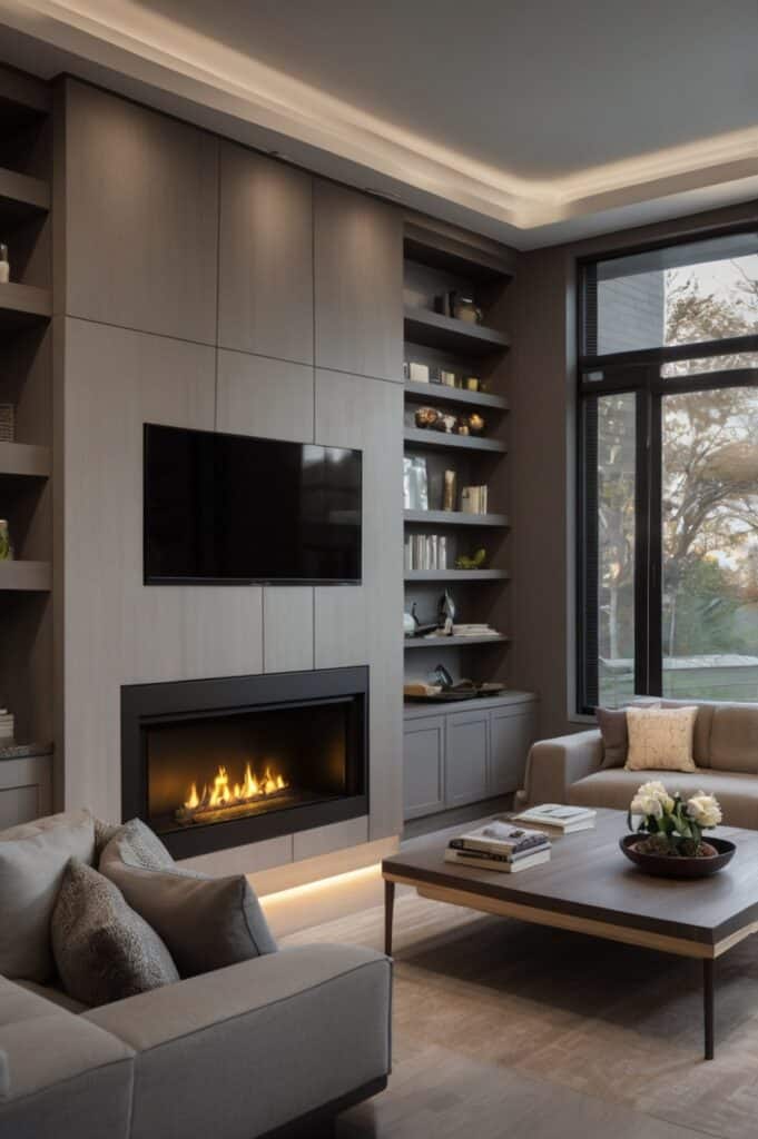 Yes, it’s 2025 and yes, your TV can hide. Imagine a gas fireplace in the corner, and above it, a built-in TV lift that lowers only when you want it.