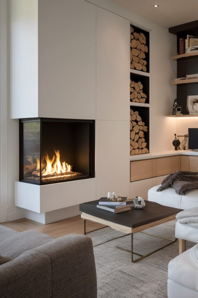 Corners are sneaky spots, so why not sneak storage into them too? Build shelves or cabinets right around the gas insert, and suddenly the whole area works harder.