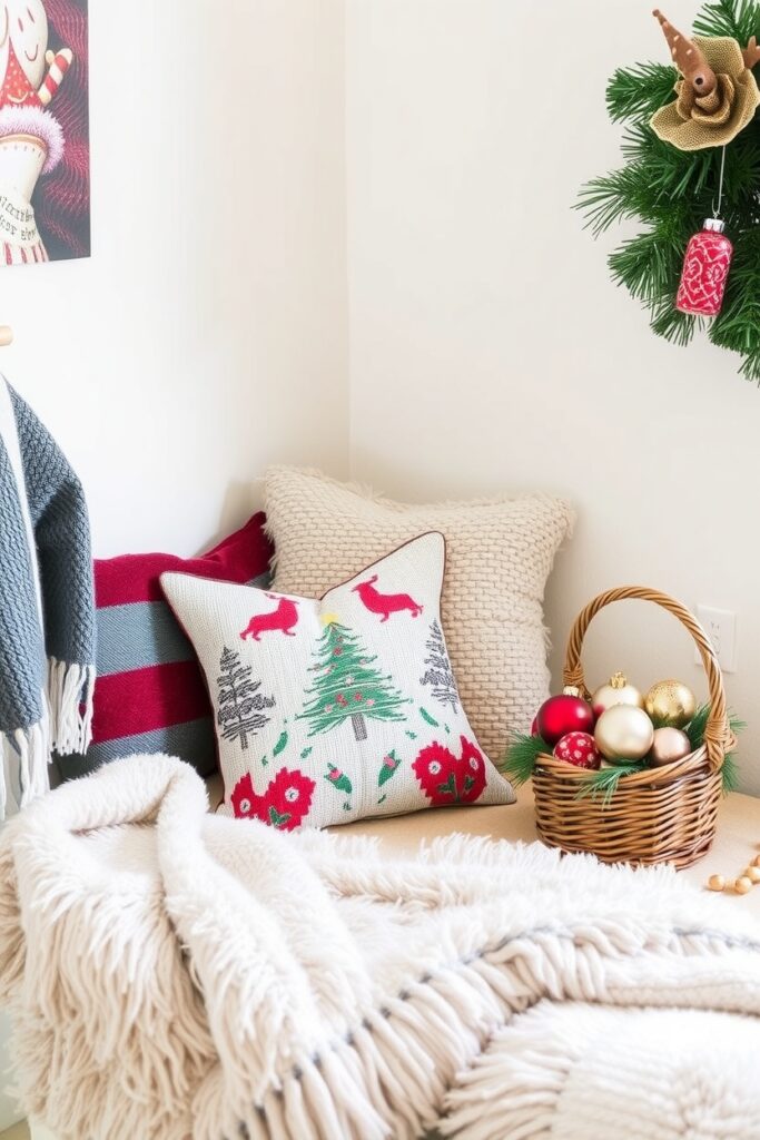Create a Christmas nook with layered blankets, furry textures, and a throw pillow with a delightfully strange pattern.