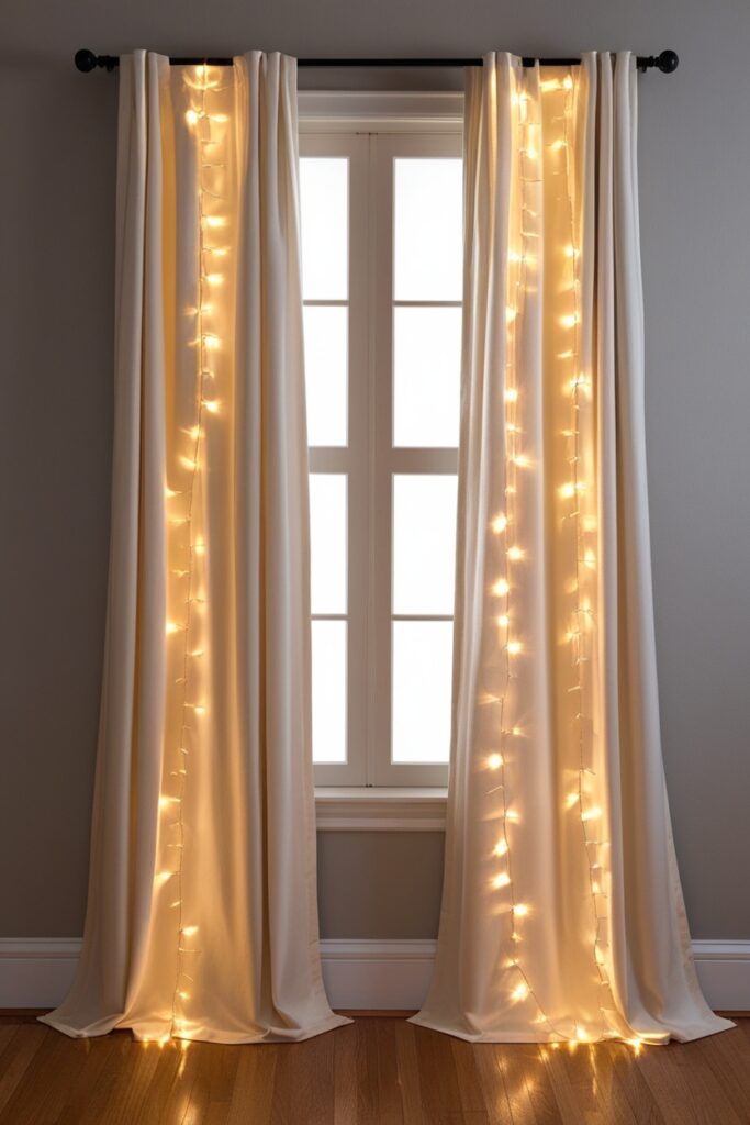 13. Add a Soft “Christmas Curtain Glow” Behind Your Drapes