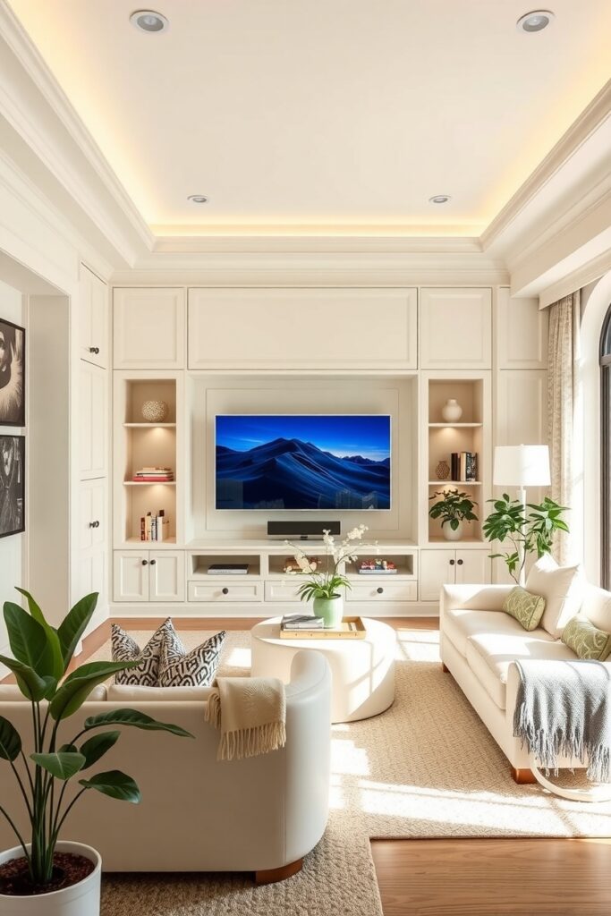 Use built-in cabinets painted in the same creamy tone as your walls to hide screens, wires, and speakers. Let your smart lighting blend into the ceiling.