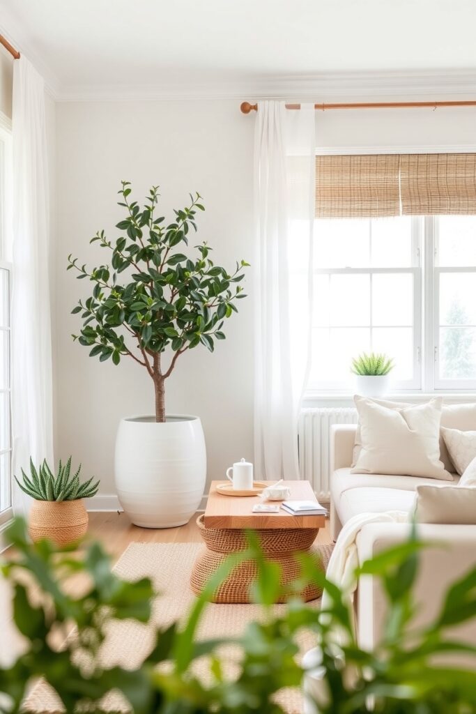 Place a few pale succulents in handmade white pots. Maybe a tall indoor olive tree standing proud in a cream ceramic planter.