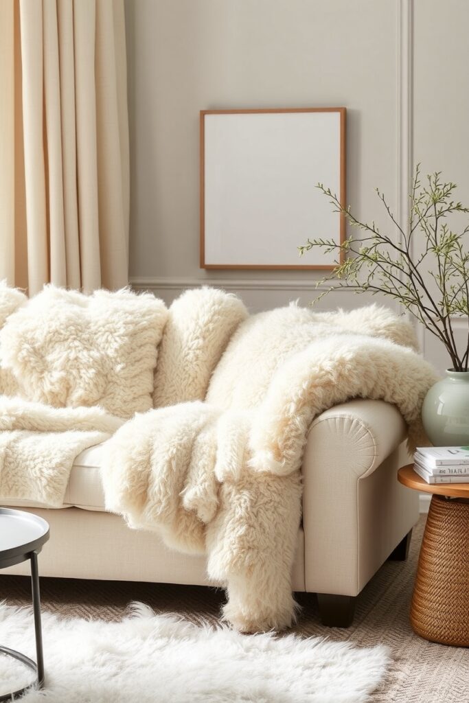 17. Cream Upholstery Mixed with Fuzzy Mohair Throws