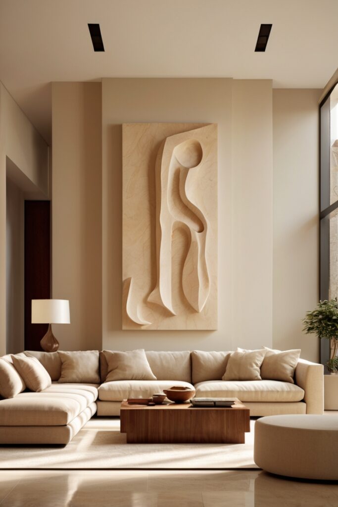 14. Cream Room with a Single Oversized Wooden Sculpture