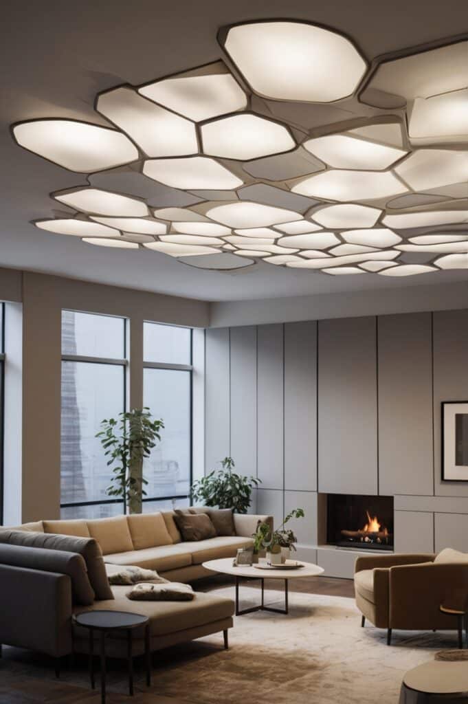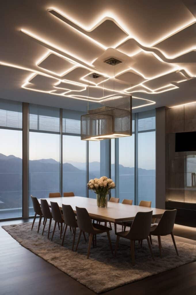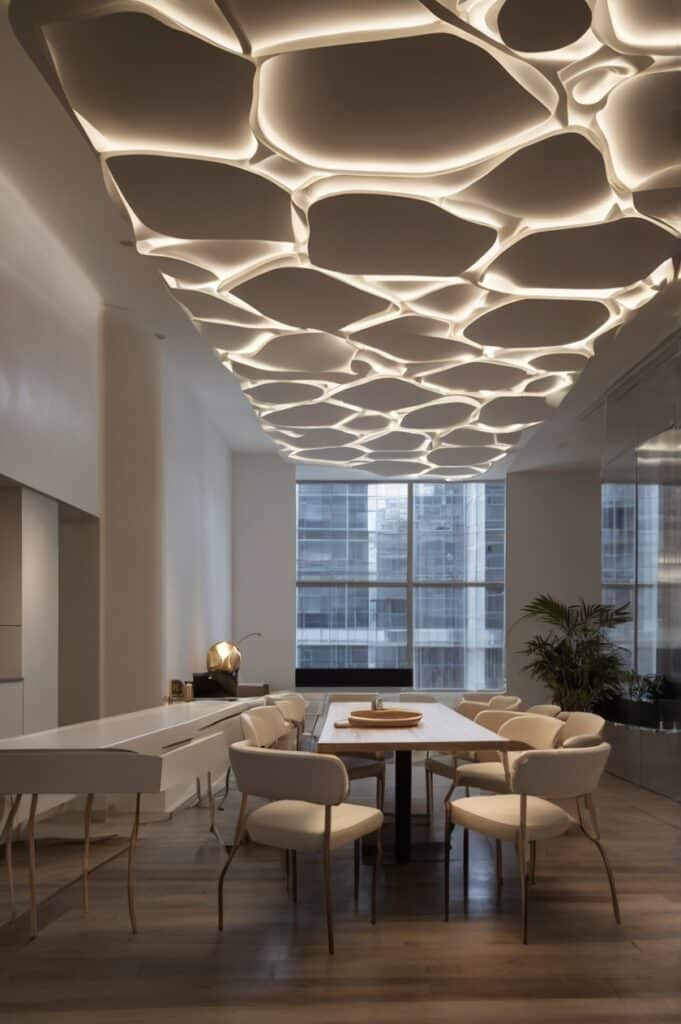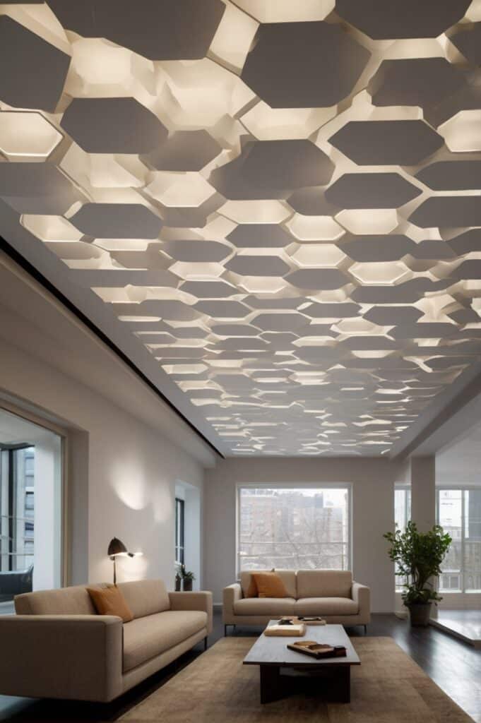 Ceilings are escaping flat planes entirely. Picture 3D sculptural grids honeycomb, geometric pyramids, folded origami shapes. LEDs tuck inside each angle, creating glow that shifts as you move.