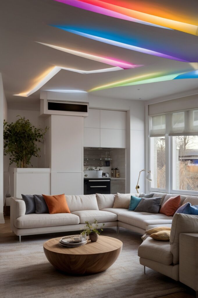 Forget boring white light pouring down. Imagine hidden prisms inside a drop ceiling splitting beams into faint rainbows that skate across the room. Not harsh disco vibes just delicate, shifting color like sunlight sneaking through glass.