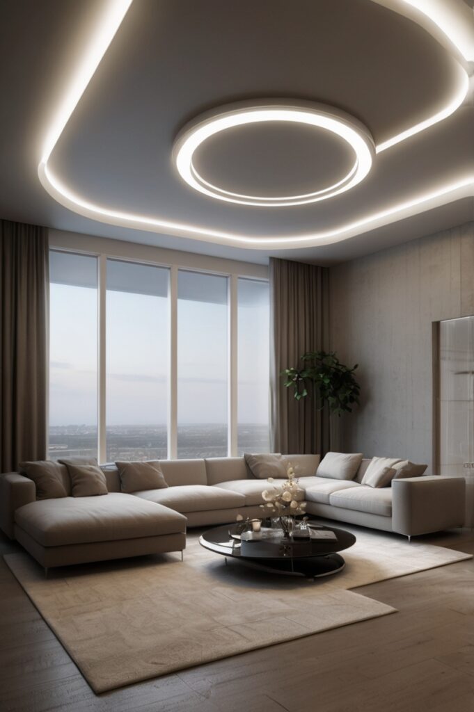 Imagine thin LED halos circling around your ceiling, floating like they’re not attached to anything at all. They don’t meet the walls, they just hover making your room feel endless, borderless, like it’s leaking into space. It’s weirdly calming, almost unsettling in a good way.