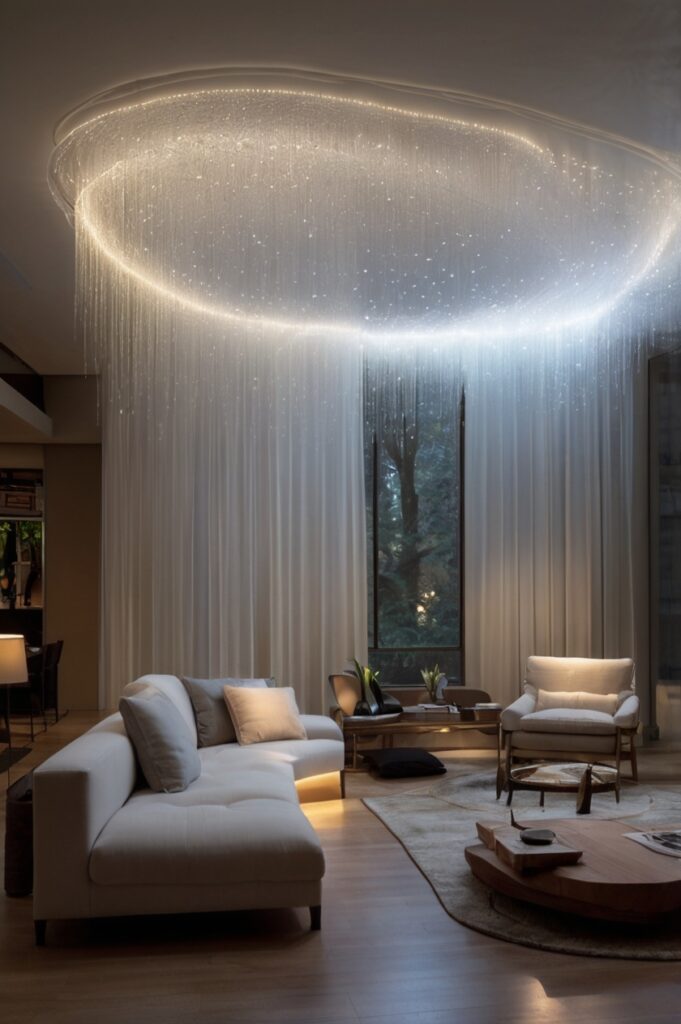 Instead of flat light, some ceilings now release thin streams of fiber optics hanging downward. Not too long, just enough to shimmer like glowing threads. They sway slightly if air moves, catching the glow in unexpected ways.