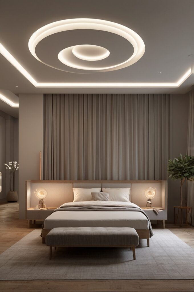 The lights peek out between the layers, creating soft tunnels of glow. It’s subtle but powerful, making small rooms look taller, bigger, more ambitious. The ceiling stops being flat and starts being dimensional.