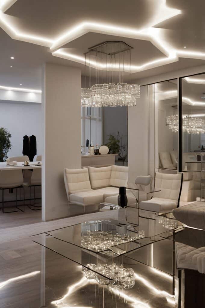 Corners of rooms used to be ignored, hidden in shadows. Now, designers are pouring soft LED strips along the very edge of drop ceilings, where ceiling and wall meet. The glow melts the hard corner lines, making the room feel curved, soft, almost liquid.