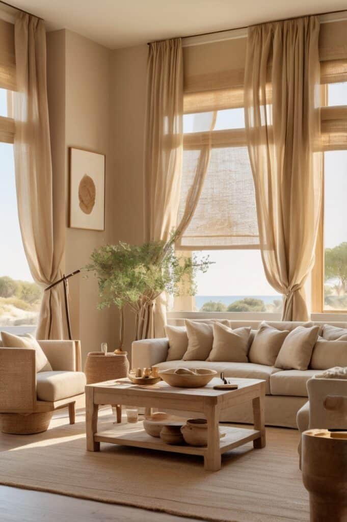 Heavy drapes weigh a room down, but sand-colored fabrics that sway softly feel alive. Linen curtains in muted beige or pale desert tones filter sunlight into a golden glow. They look best when they hang loose and un-ironed, like they don’t care.
