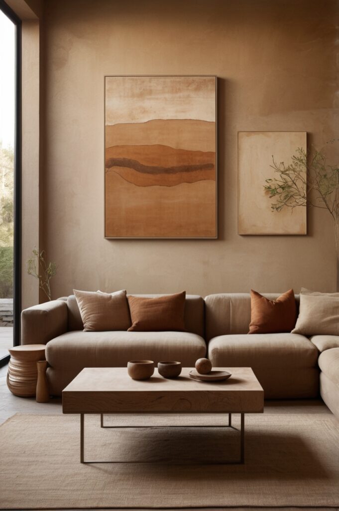 Instead of shiny prints, go for art that looks like dirt, clay, or soil got involved. Abstract paintings in ochre, sienna, olive, and muted rust tones carry the colors of the ground. Brushstrokes that feel messy and textured draw you in.
