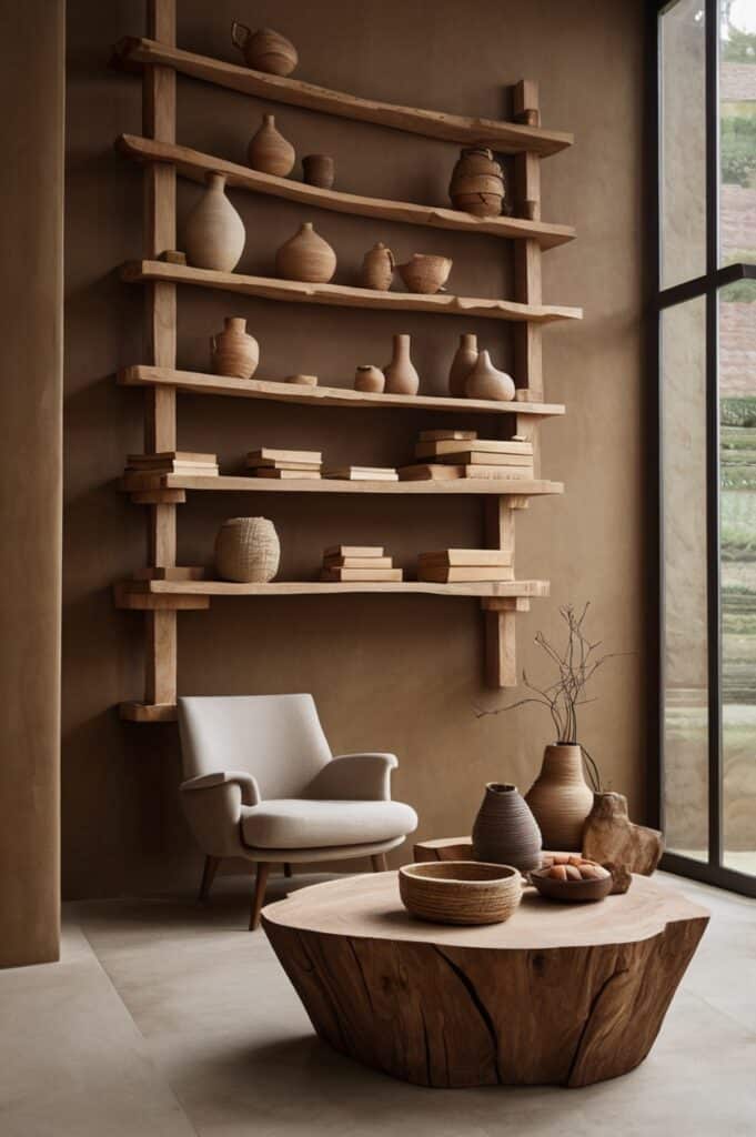 Forget clean white shelving units. Planks of raw wood, with edges still a bit jagged, turn into shelves that feel more like trees than furniture. When you line them with books, plants, or ceramics, they look like they grew there naturally.