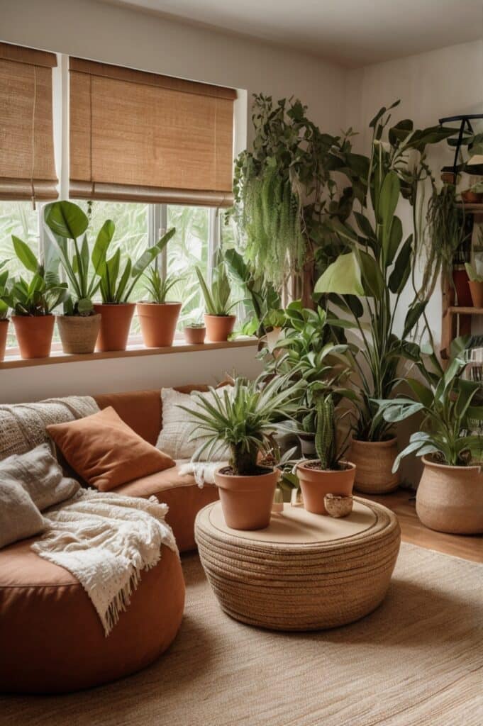 Earthy decor without plants is just cheating, honestly. The trick is not one sad fiddle-leaf fig in the corner, but groups of plants that whisper to each other. Big leafy ones, tiny moss pots, and hanging vines all tangled like gossip.