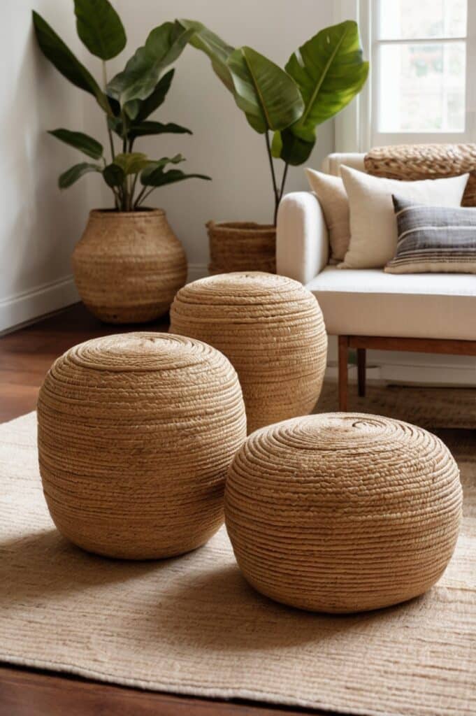 Plastic storage kills the vibe. Handwoven baskets, made of cane, rattan, or palm, hide clutter while doubling as decor. A big one by the sofa for blankets, smaller ones tucked under a table for magazines it’s practical and earthy at once.