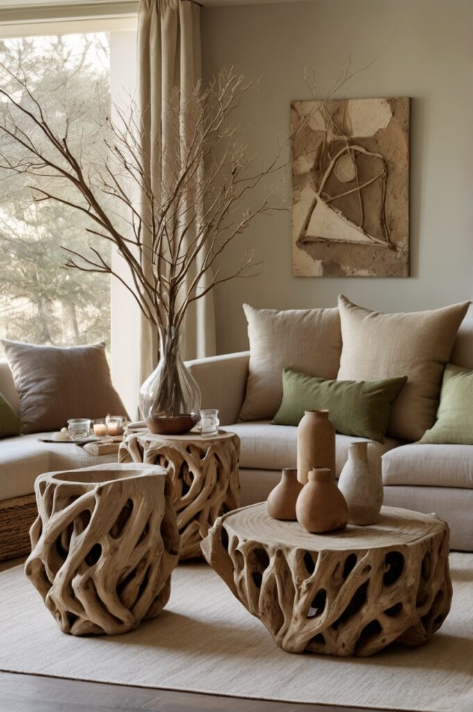 A driftwood coffee table that doesn’t care about being perfectly level? Beautiful. Even a small piece sitting on a shelf, holding candles or books, creates a grounded focal point. People will touch it without realizing, drawn to its texture like moths to a flame.