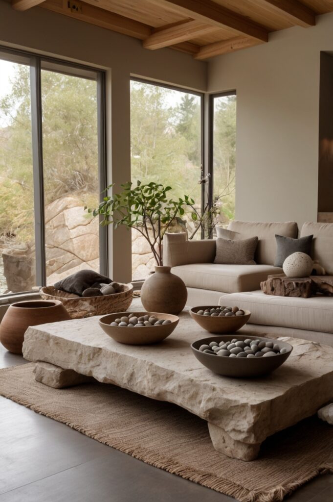People forget how powerful the simplest objects are. A shallow bowl filled with river stones or pebbles collected on walks makes the room hum with nature. Stones don’t do anything, yet their stillness has presence.