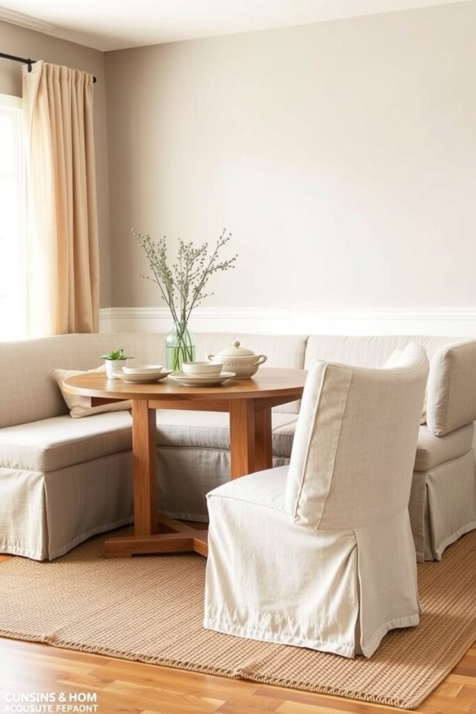4. Linen-Wrapped Built-In Banquettes for a Soft Farmhouse Feel
