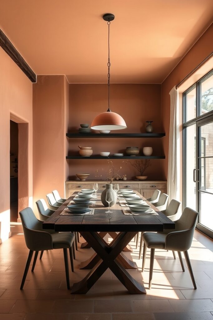Soft clay-toned walls are having their glow-up moment in 2025. They feel quiet and earthy but still modern in a sneaky, gentle way. Pair them with charred wood shelves or a slightly burnt-finish dining table to give the room a bold, grounded heartbeat.