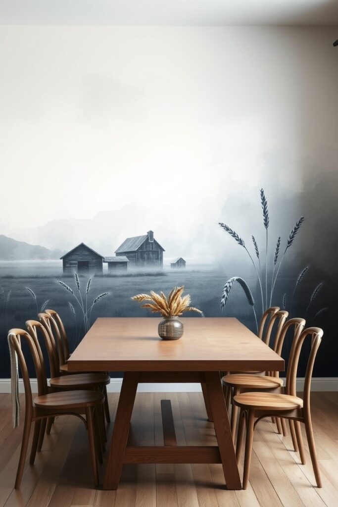 Instead of solid-color walls, 2025 farmhouse dining rooms are experimenting with muddled-ink murals. Soft, blurry shapes that hint at fields, barns, or windy trees but nothing too literal. It’s like the memory of a farmhouse painted itself across the wall.