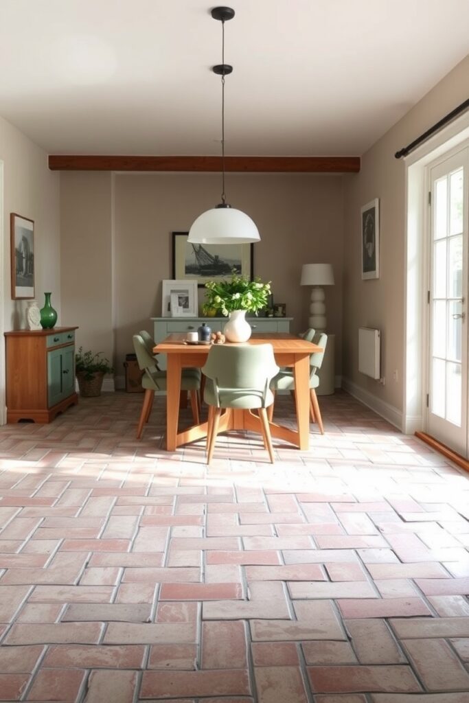 Brick flooring has stomped its way back into dining spaces, but 2025 wants it smoother and softer. A limewash finish gives the brick this airy, powdery look that feels old and new at the same time. The floor becomes a quiet storyteller that doesn’t brag about its age.