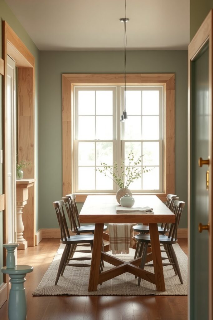 Chalky sage paint is everywhere this year, but pairing it with unfinished plywood trim gives the dining room this quirky, modern-rustic mix that feels strangely charming. The plywood edges look casual, almost cheeky. The sage walls soften everything like a gentle whisper.