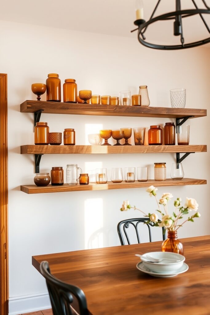 Glassware is going earthy with clay-tinted tones soft browns, muted oranges, dusty creams. When displayed on simple rustic ledges, the whole setup looks like a farmhouse art gallery. Warm, gentle, and quietly proud.