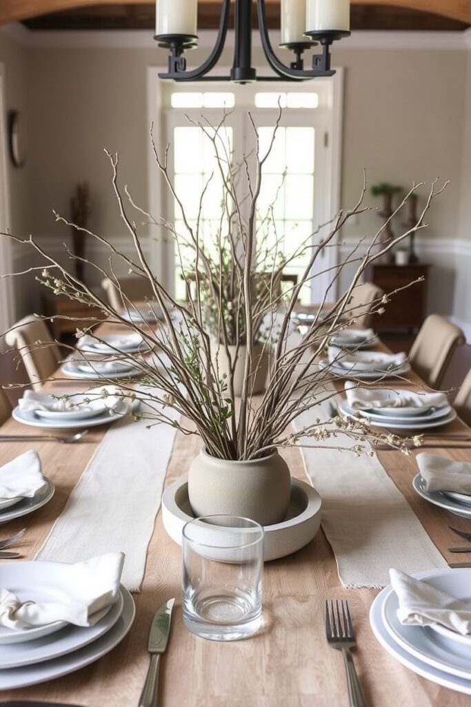 Let the branches bend weirdly. Let them do their thing. A farmhouse dining table should feel like nature snuck indoors and decided to stay for supper.