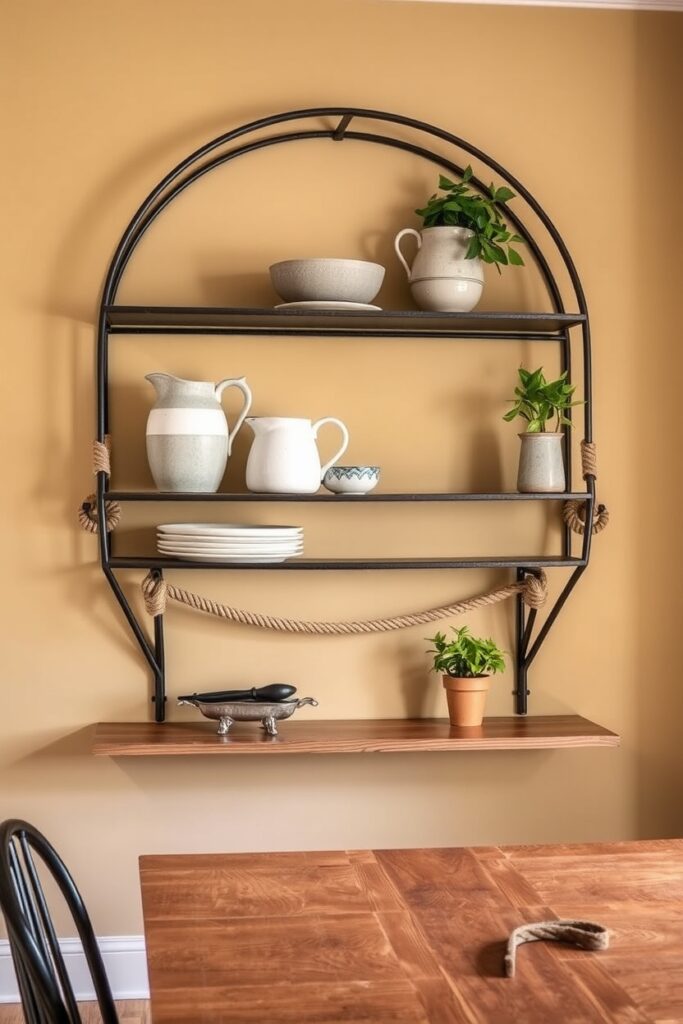 14. Curved Iron-and-Rope Shelving for Rustic Edge and Soft Lines