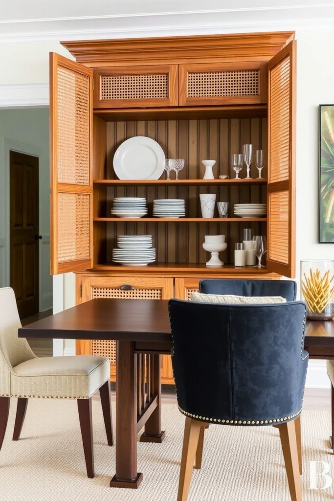 18. Wide-Leg Cane Cabinets With Velvet-Lined Interiors