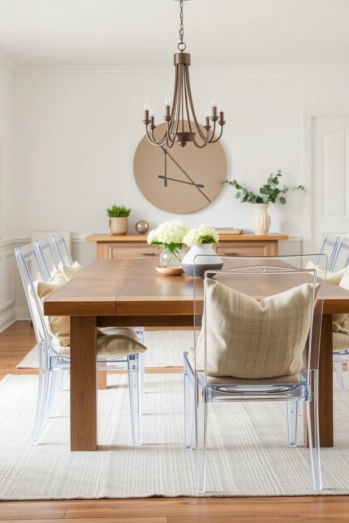 6. Ghost-Frame Chairs With Rustic Textured Cushions
