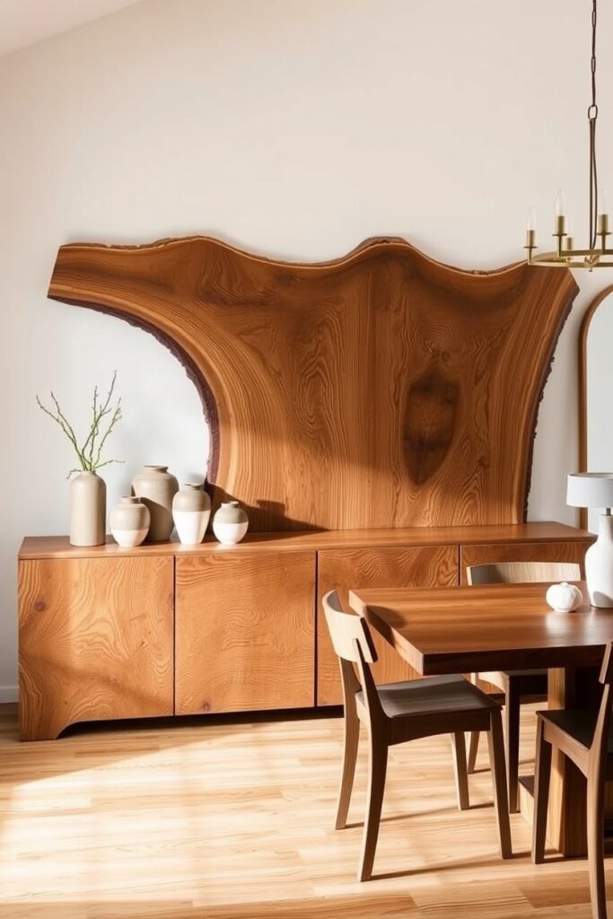 Sideboards with wavy, natural-edge oak slabs are a top farmhouse-modern choice this year. They look like the tree decided not to follow straight lines anymore and honestly, who can blame it? The irregular edges soften the entire room.