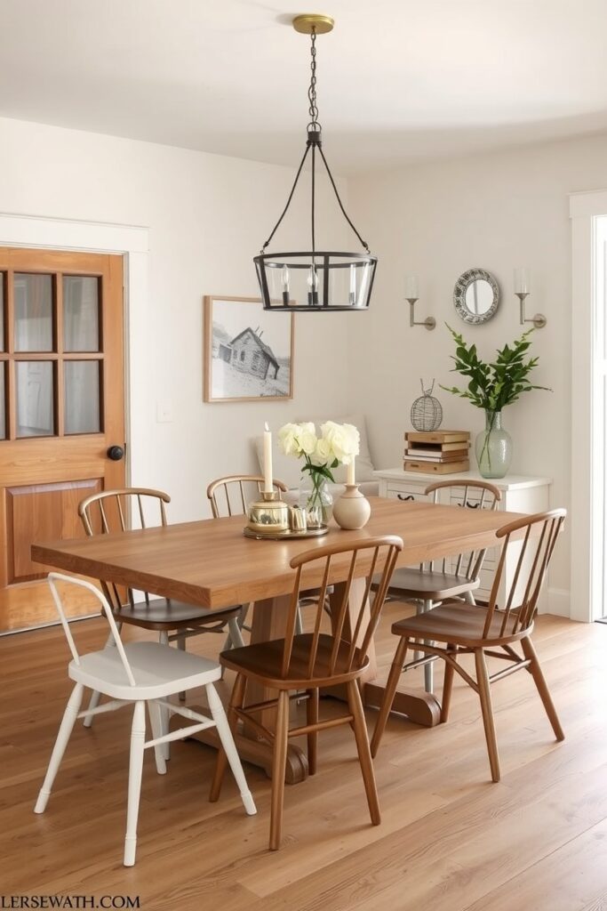 Farmhouse dining rooms in 2025 are ditching the “one metal only” rule. Instead, they’re mixing aged brass with brushed nickel for a vibe that feels collected rather than curated. Brass warms the room. Nickel cools it down. Together they balance each other like two old friends who argue but always sit together anyway.