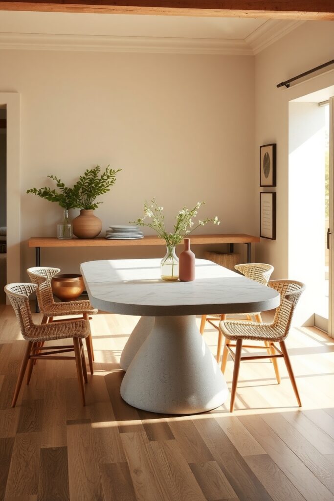 Sandstone pedestal tables are the new “unexpected hero” of farmhouse-modern dining. They look earthy and ancient but shaped in a clean, almost futuristic silhouette. It’s like rustic style took a trip to a museum and came back classy.