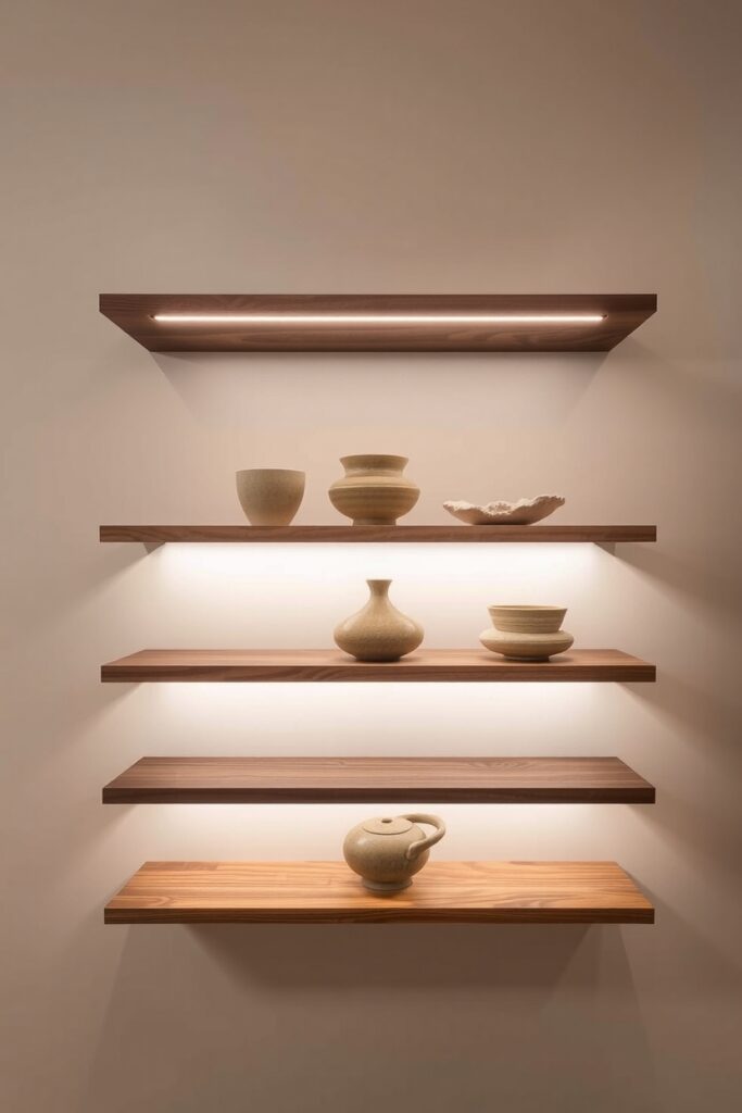 This one’s all about glow. Brushed brass, matte black, or champagne gold thin metal shelves that look almost too sleek for their own good. But hidden beneath them, a soft LED strip hums quietly, turning your wall into a glow show after sunset.