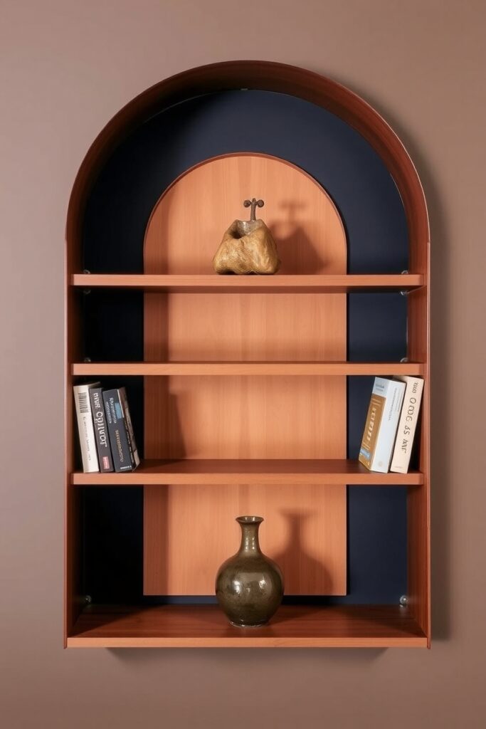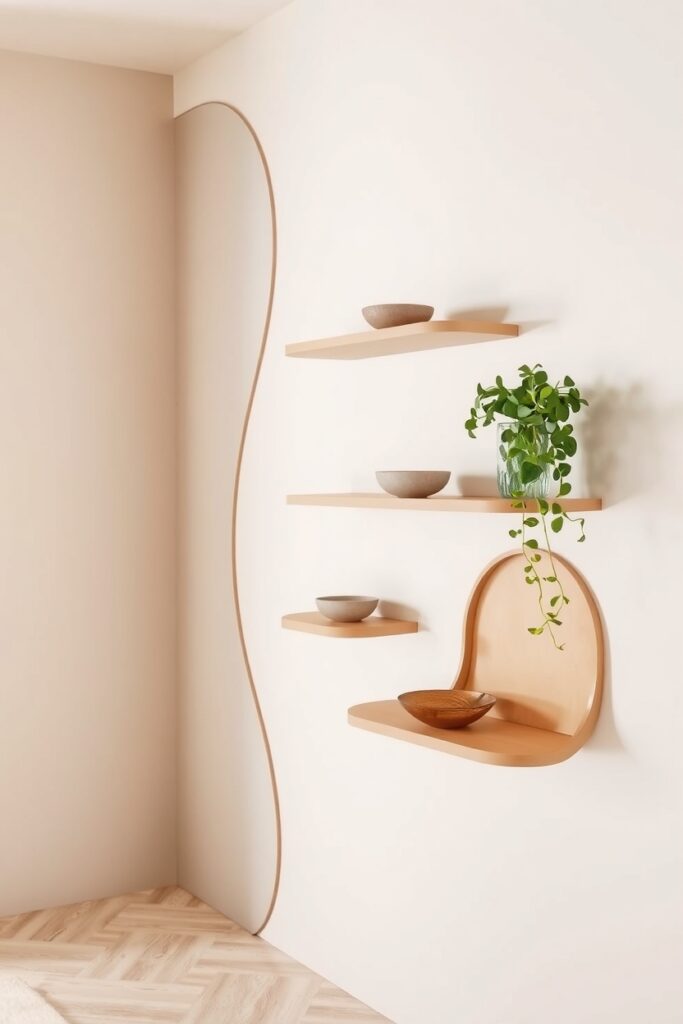 Set a few curved ones at different heights. Let them flow like melody, not math. Decorate with rounded forms bowls, small plants, even a pebble or two. The eye follows the curve, and the wall suddenly feels like it’s moving.