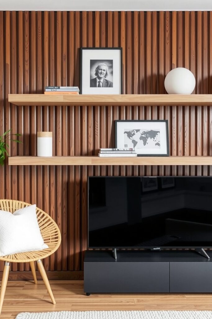 Top shelf: pale wood or white. Middle: mid-tone oak. Bottom: deep espresso. The gradient makes your wall feel taller, almost cinematic.