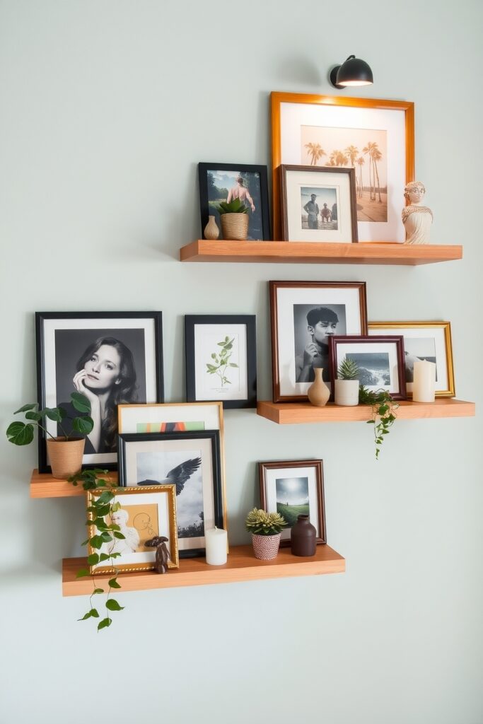 Mount 2–3 floating shelves, all at irregular heights. Now layer them with framed prints, small sculptures, candles, and even tiny plants. Lean the frames against the wall no hanging, just resting. It feels spontaneous, like creativity left in progress.