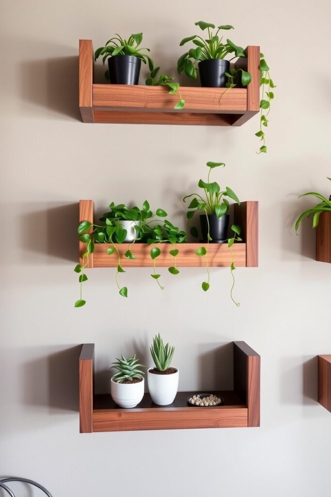 Floating planter shelves combine wood or metal bases with small built-in planters or slots. You can fill them with trailing ivy, air plants, or even tiny succulents. The greenery spills softly over the edge, making the shelf feel alive, almost feral.