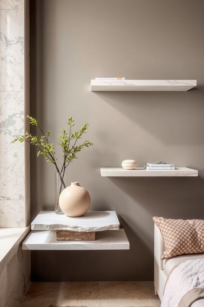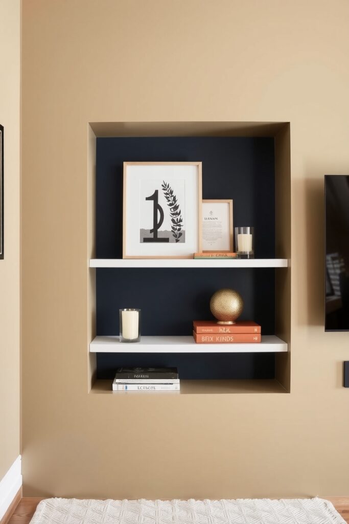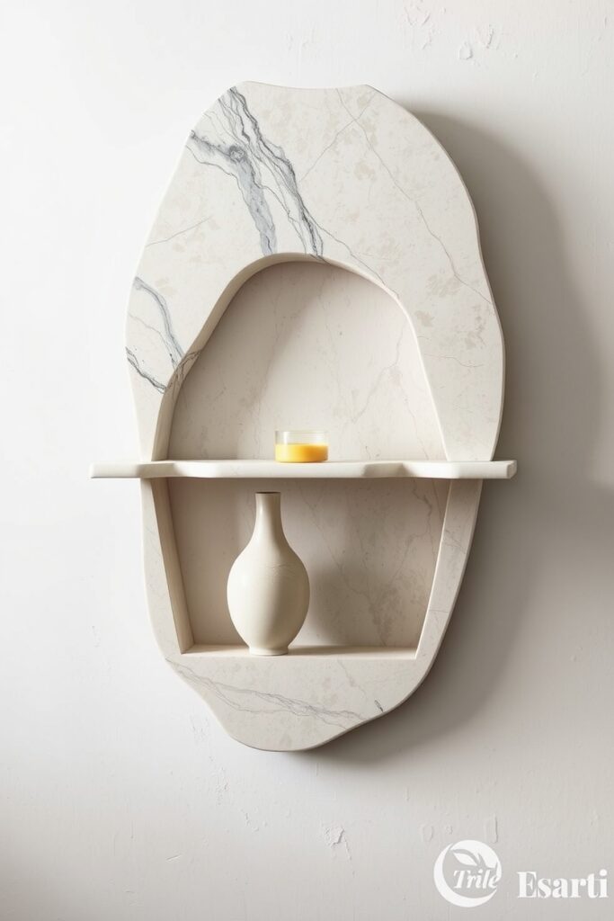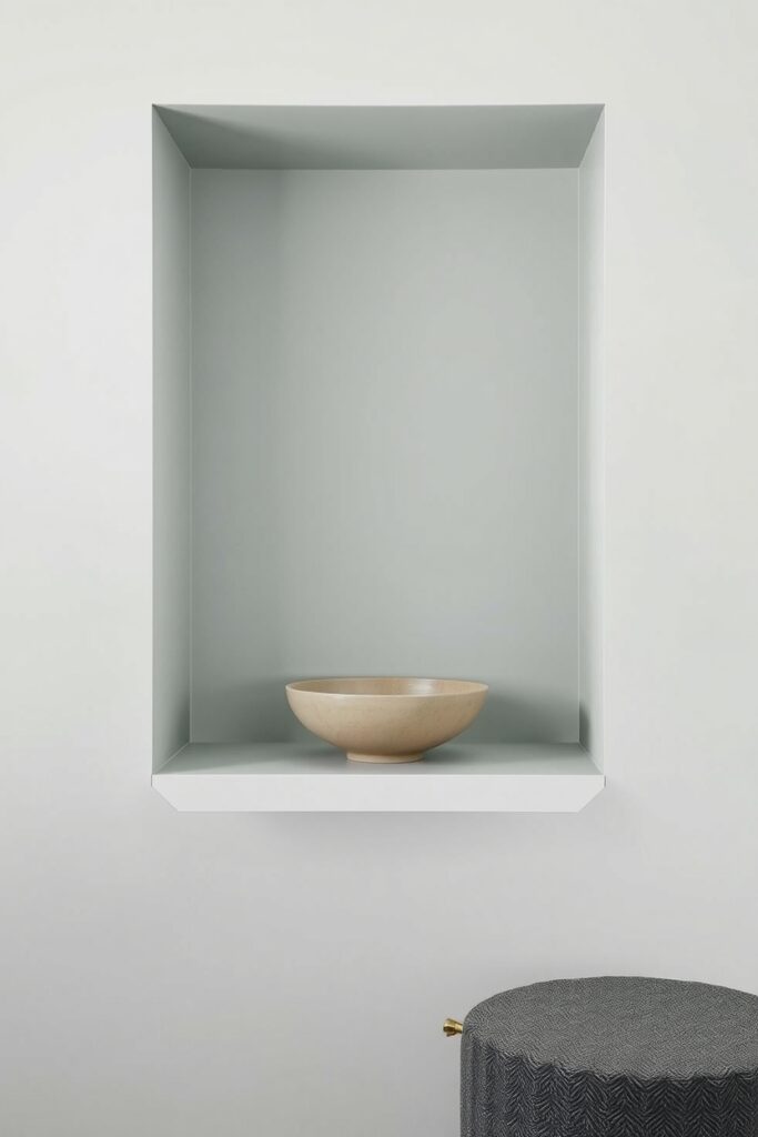 The floating niche illusion takes a minimalist route. Instead of mounting a shelf on the wall, you build or fake a shallow recessed niche and let the shelf hover inside same color, same tone. You can even add lighting inside the niche for that museum-grade look.