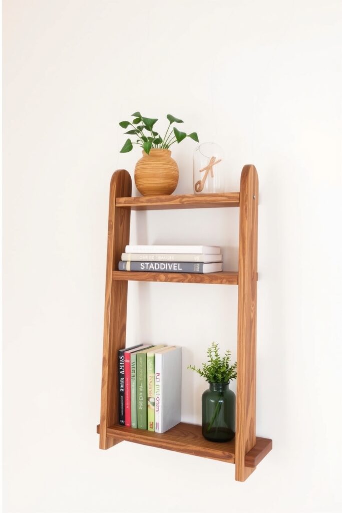 Now this one’s cheeky. Imagine half a wooden ladder sliced and mounted horizontally in pieces, each “rung” floating separately. It’s art disguised as storage.