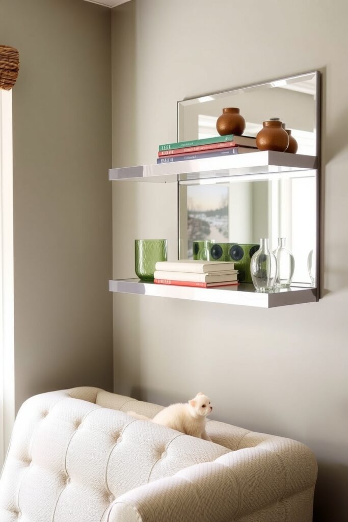 Floating shelves with mirrored backing double the space visually and bounce light across the room like quiet fireworks.