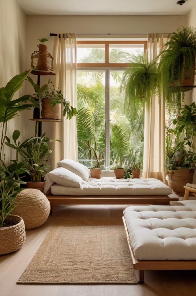Imagine your futon nestled between tall plants, almost like it sprouted there. Ferns on the floor, ivy on a shelf, maybe even a small lemon tree in the corner. The bed becomes part of a living, breathing jungle.