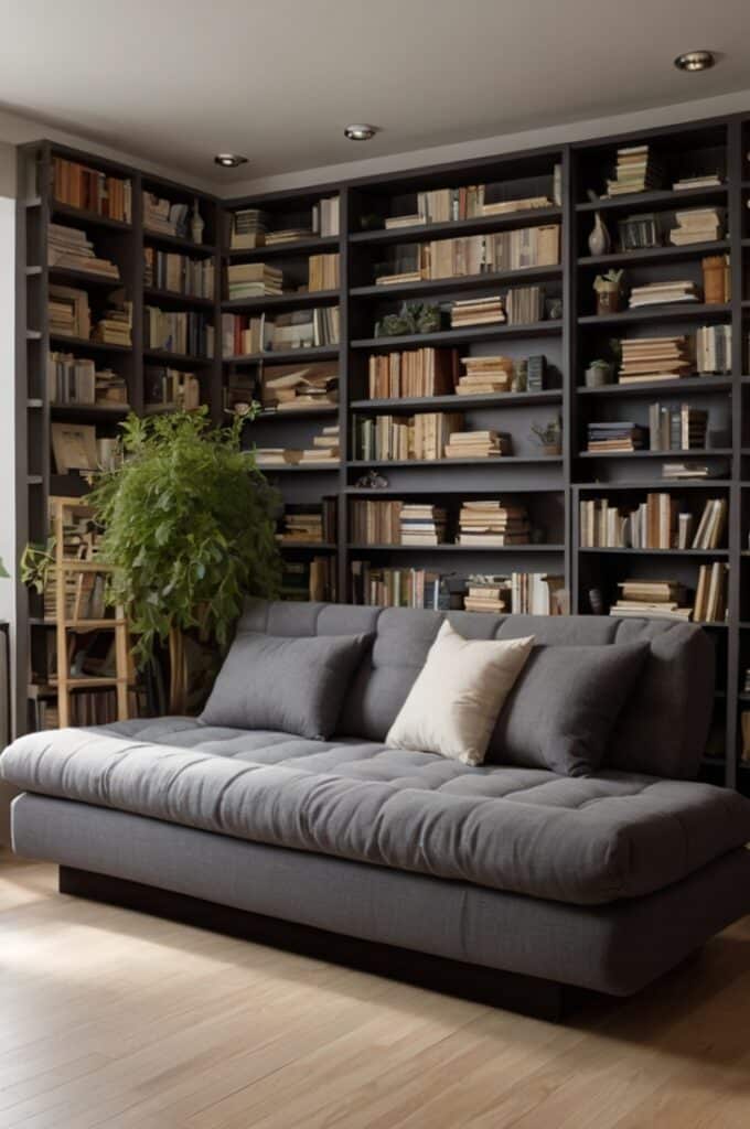 Why not turn the futon into the centerpiece of a reading cave? Build or buy bookshelves that frame it from both sides. A wall of spines creates warmth and character without trying too hard.