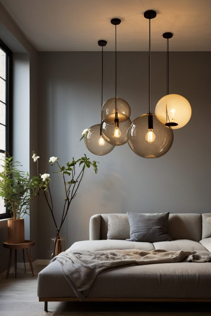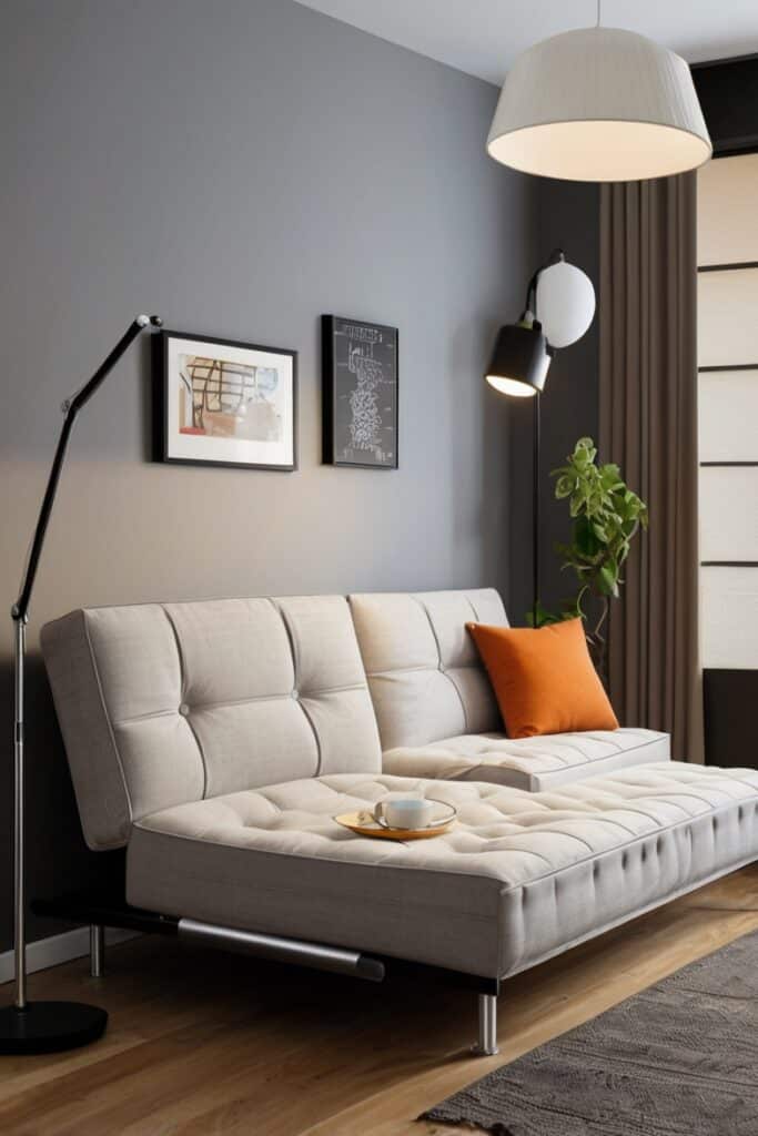 Instead of regular lamps, place artistic lighting around your futon. Think paper lantern spheres, geometric LED arcs, or even floor lamps shaped like tree branches. The futon then becomes part of an art installation.